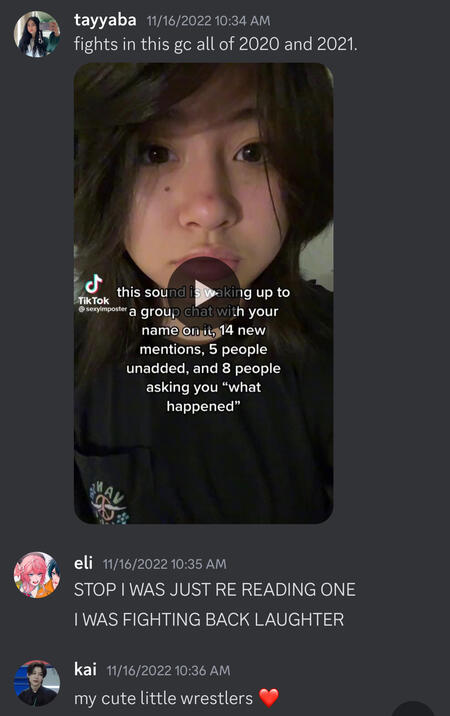 The Family Groupchat, commonly known as FGC, is a group chat that was formed by Tayy. The group consists of nine members: Kai,Tayy,Zaek,Dante,Megan,Elissa,Liv,Ny and Caony. They debuted on June 22, 2020.